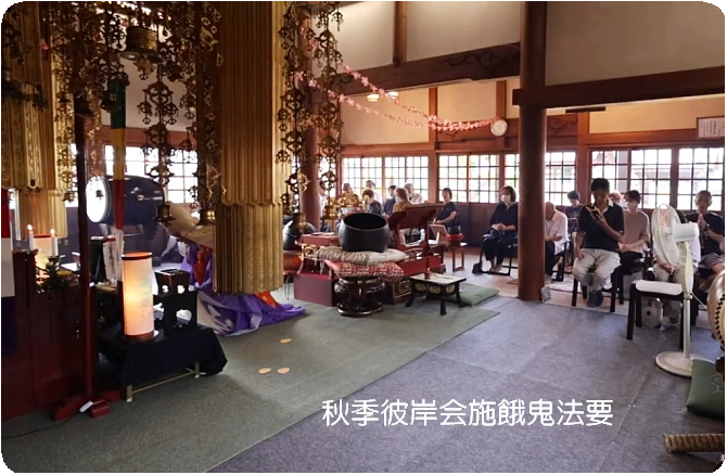 秋分の日前後にあわせて法要を行い、ご先祖様の追善の施餓鬼供養をいたします。 |